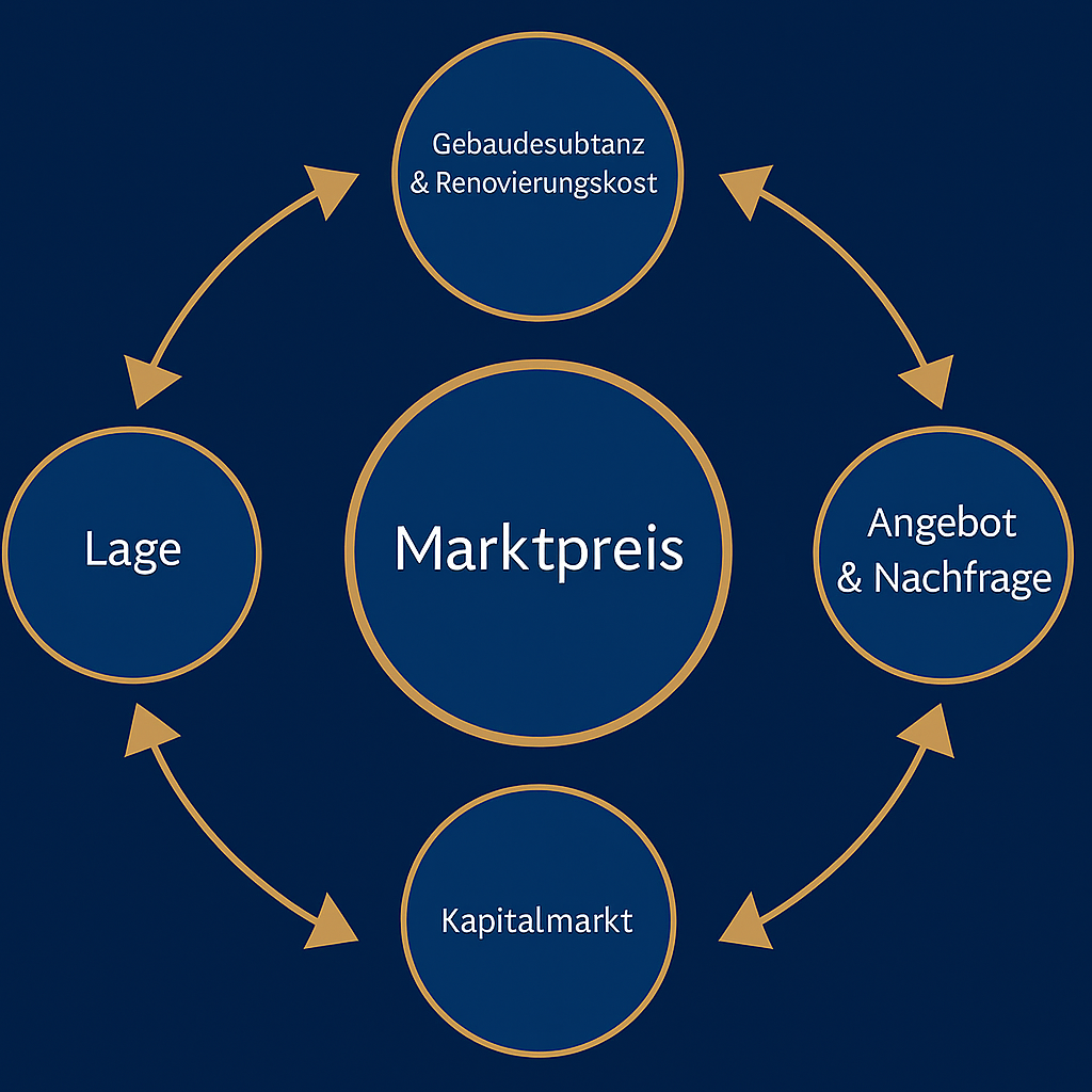 Neben einer strukturierten Betrachtung und Datenaufbereitung Ihrer Immobilie berücksichtigen wir die zusätzlichen Parameter und Stakeholder - Finanzierung, Grundbuch, Bau- und Renovierungskosten, Nachfrage und zusätzliche Angebote.